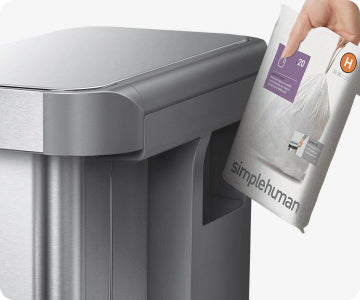 Conservare le fodere nel porta sacchetti, estrarre una fodera fresca dall'interno della pattumiera e chiudere il bordo per sacchetti per nasconderla e mantenerla in posizione.