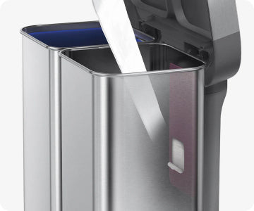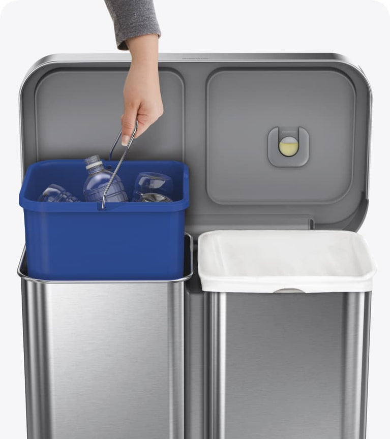 La nostra opzione a doppio scomparto fa sì che la raccolta differenziata dei rifiuti abbia un bell'aspetto! Ogni lato ha una capacità generosa, e lo svuotamento è facile con un secchio di plastica sul lato della raccolta differenziata e una tasca per sacchetti nel vano rifiuti.