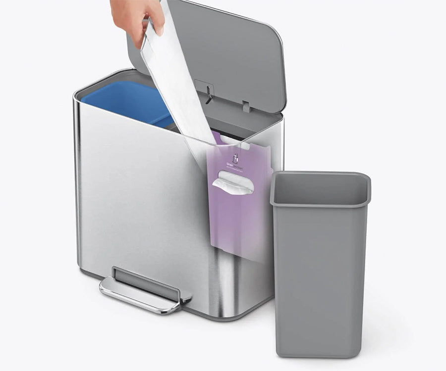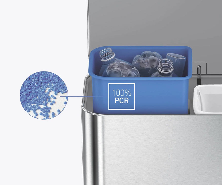 Prodotti al 100% in plastica post-consumo riciclata, i cestini interni si sollevano per velocizzare il cambio del sacchetto e agevolare la pulizia.