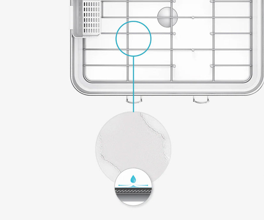 Il vassoio interno in plastica è progettato per uno scarico ottimale grazie a un rivestimento idrofilo che diffonde l'acqua in modo delicato sulla superficie per un'evaporazione super rapida; inoltre, lo scarico centrale in acciaio inox si occupa del resto e si svita per una facile pulizia!