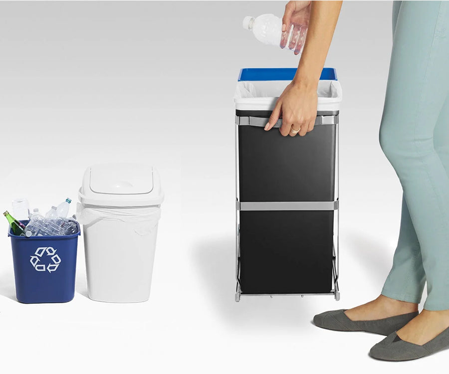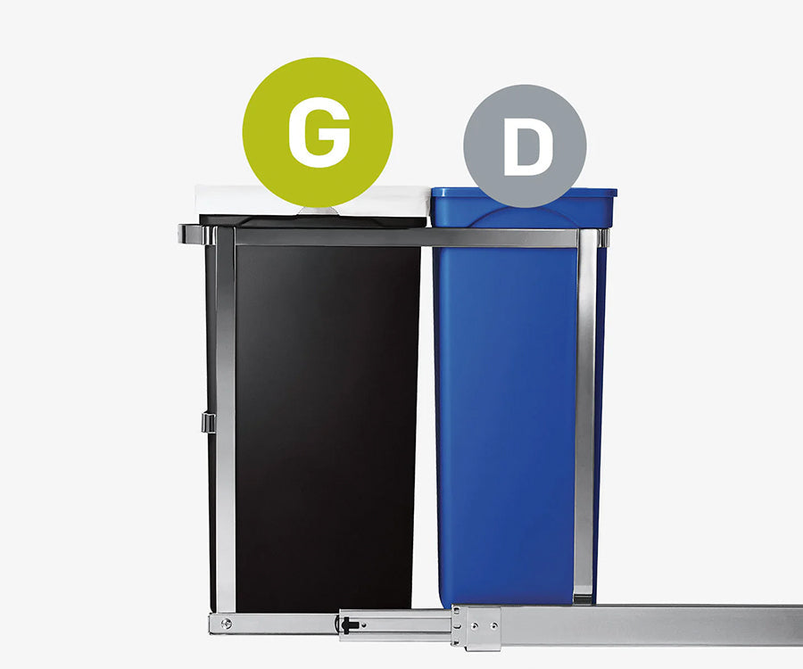 Il nostro cestino con doppio secchio permette di mettere in ordine i rifiuti e gli articoli destinati al riciclo. Un lato per i rifiuti , l'altro per gli articoli destinati al riciclo. Rende il riciclo molto efficiente in termini di spazio.